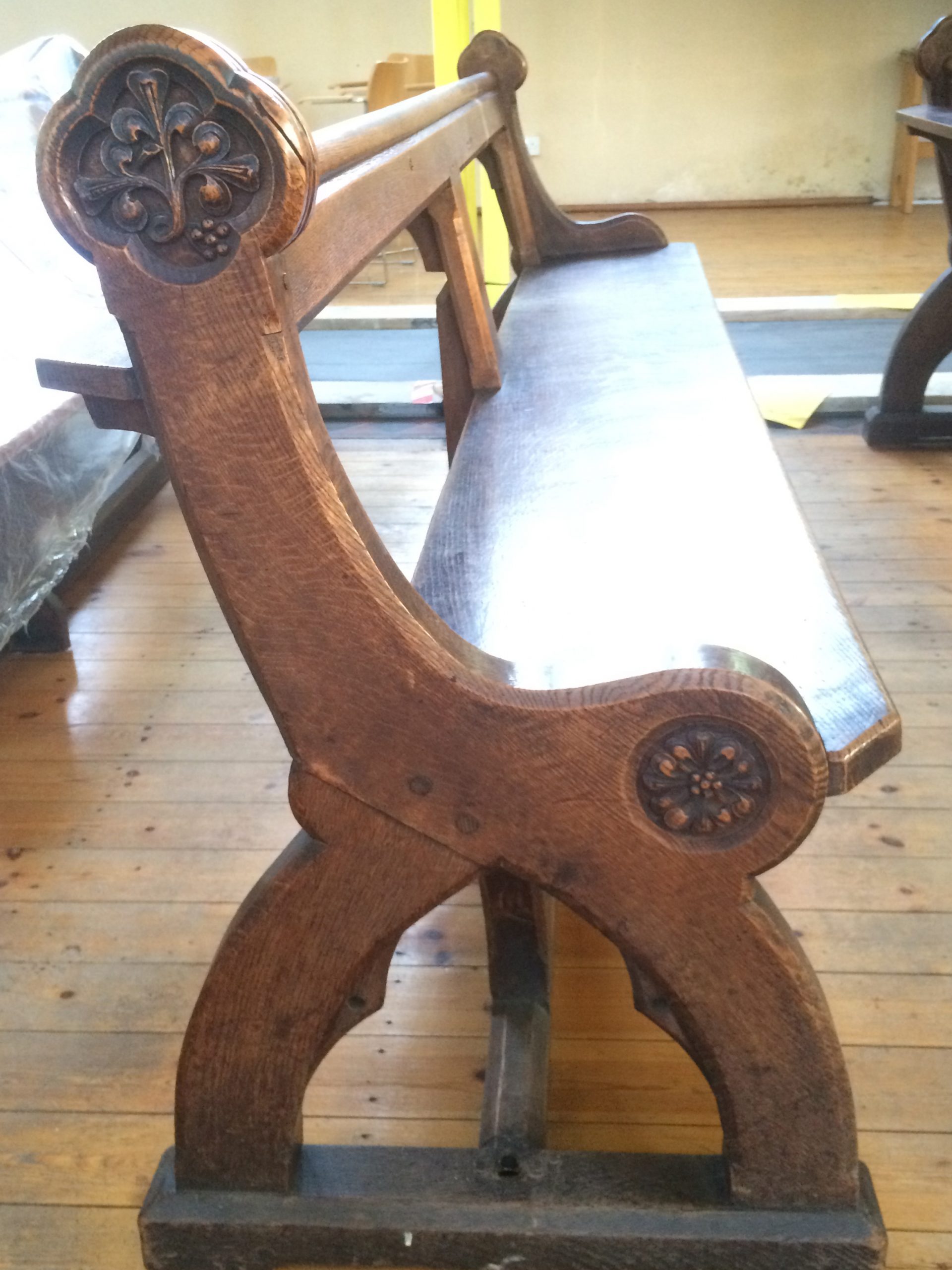 Among the noteworthy chairs in the church is a Faldstool, a portable chair used only for special occasions, such as a visit by the Bishop. This was gifted to the church by Ann Grieve in memory of her husband, Peter, and it bears a small brass plaque to that effect. It has a red leather seat and back, and is situated in the north aisle.