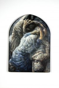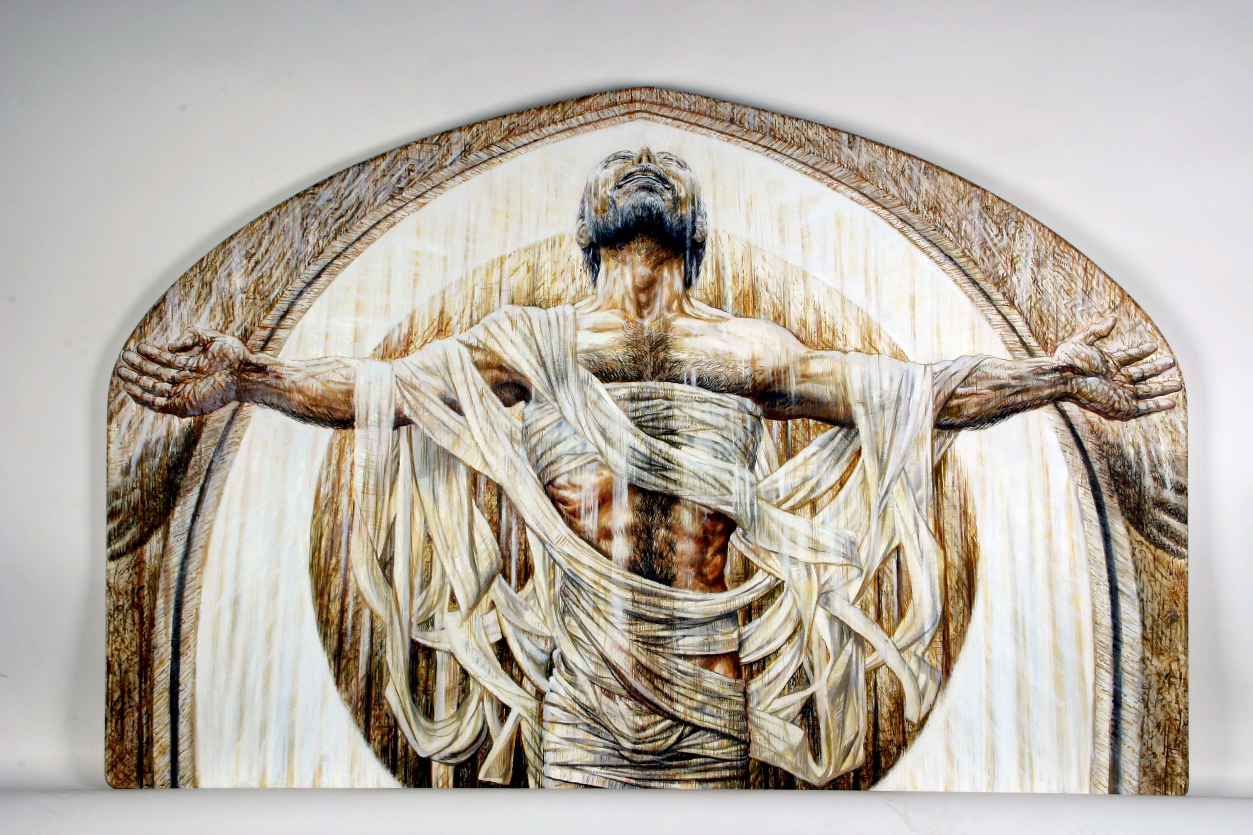 Here at St John’s, the altarpiece of the resurrection in the Lady Chapel was added to the traditional fourteen stations. Iain McKillop writes: ‘The realism of the paintings is designed to emphasise the physical truth of Christ’s sacrifice. His figure is idealised however, suggesting his authority and his strength to form and redeem creation, to carry and support us. This station hangs behind the Lady Chapel altar, suggesting hope to those who come to pray, who may be suffering from grief and pain like Mary. The Risen Christ’s embrace is behind the priest presiding at the altar. As the Eucharistic elements are raised we are reminded that Christ’s sacrifice is life-giving.’