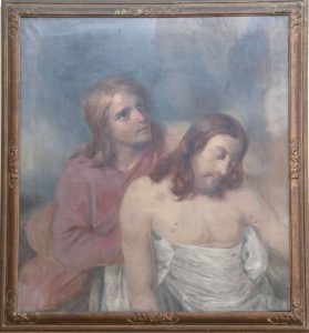The large painting in the chancel was presented by Bella Eugenie Le Butt (1862-1957) in 1949. Her father Josiah (1831-88) owned The Champion Haymaker Works in Bury St Edmunds. A corn dresser made by him can still be seen in the Museum of East Anglian Life. The image shows Christ being taken down from the cross by St John, the ‘Beloved’ disciple and a very appropriate choice for a church dedicated to St John.