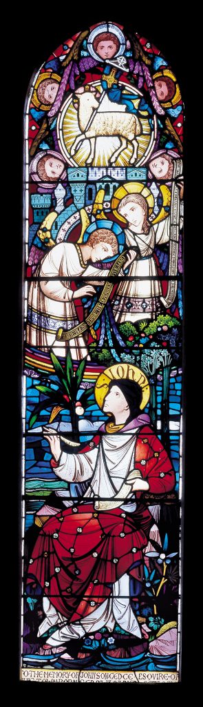 There are three important ‘St Johns’ in the Bible: St John the Apostle, Jesus’ Beloved Disciple; St John the Evangelist, author of the Gospel of St John; and St John of Patmos. However, the three are traditionally combined. St John, his name written in his halo, is shown in the act of writing, while interrupted by a vision of two angels, who hold a scroll showing the words of Revelation 14:13: ‘And I heard a voice from heaven saying unto me, Write, Blessed are the dead which die in the Lord’.