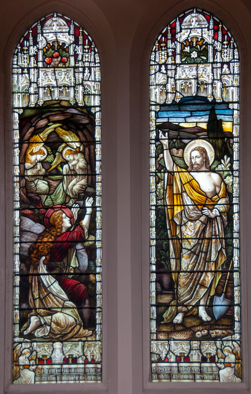 In a single composition across two ‘lights’, this window shows the moment when St Mary Magdalene recognises Christ in the garden following his Resurrection, described in St John’s Gospel. Having found the tomb where he was laid empty (along with the two angels shown to the left), she is very upset and asks a man whom she takes to be the gardener where Christ is. When he says her name, ‘Mary’, she realises that the gardener is in fact Christ. This mistake is represented by the spade lying by the edge of the image.