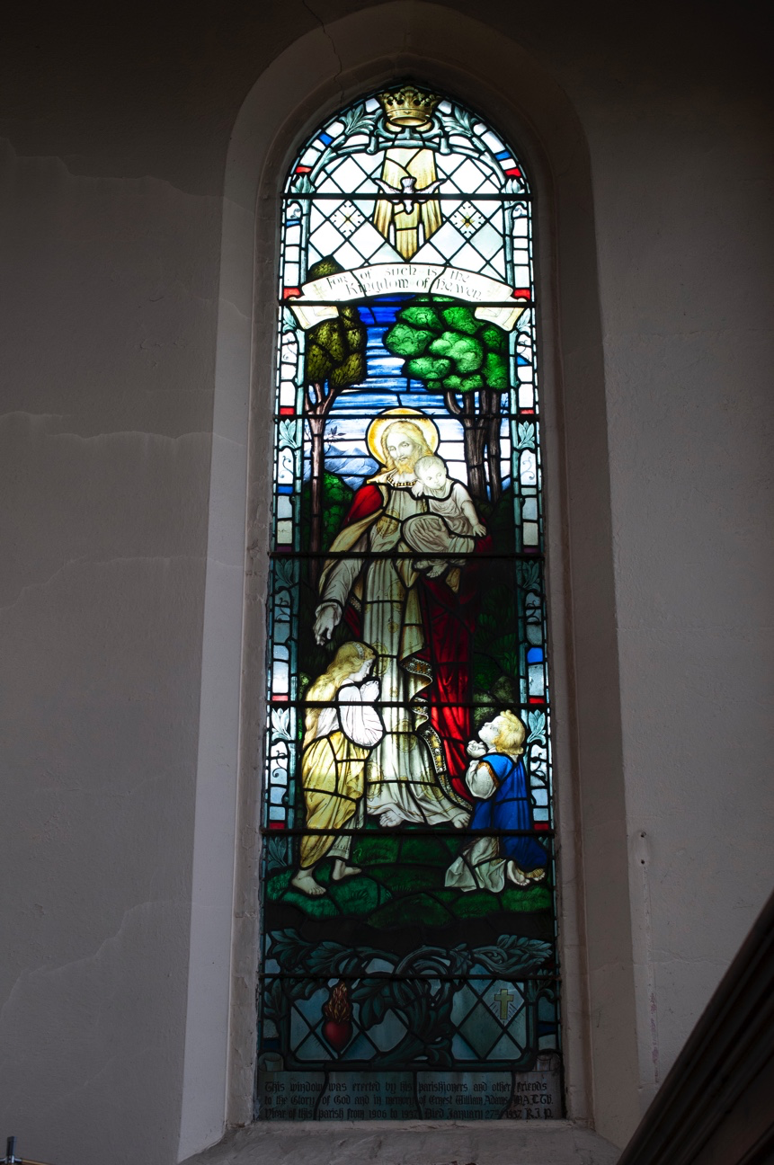The question of a suitable memorial for Canon Adams proved less than straightforward. The idea of a rood screen was rejected by the Bishop, who said no faculty could be granted for it, but he did agree to a stained glass window on the west wall of the North Aisle. The inscription chosen was the last few words of Matthew 19:14, where Jesus says (according to the King James Version), ‘Suffer little children, and forbid them not, to come unto me: for of such is the kingdom of heaven.’ Parishioners and friends of Canon Adams paid for the window, which is still the newest in the Church. So long did the process of agreeing to a memorial drag on that mention had to be made in the parish magazine of the intention to erect it for fear that people would think it would not happen.